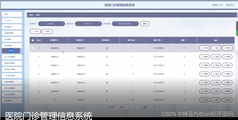 患者管理,在患者管理页面可以对索引,患者账号,患者姓名,患者性别,患者年龄,患者手机,血型等内容进行详情,修改和删除等操作,如图5-11所示。