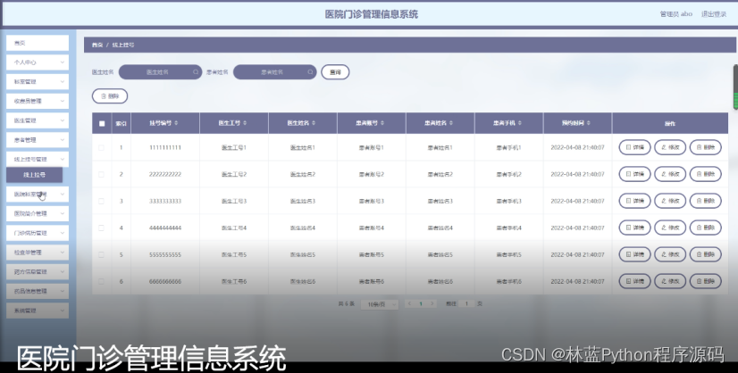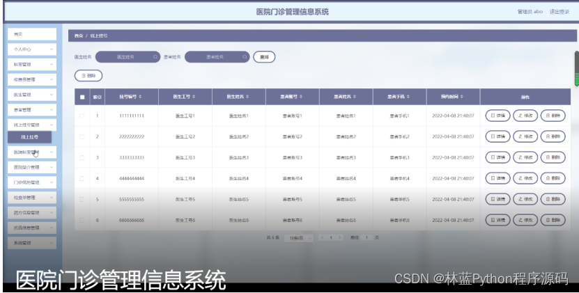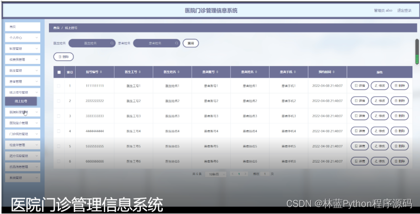 线上挂号管理,在线上挂号页面可以对索引,挂号编号,医生工号,医生姓名,患者账号,患者姓名,患者手机,预约时间等内容进行详情,修改和删除等操作,如图5-12所示。