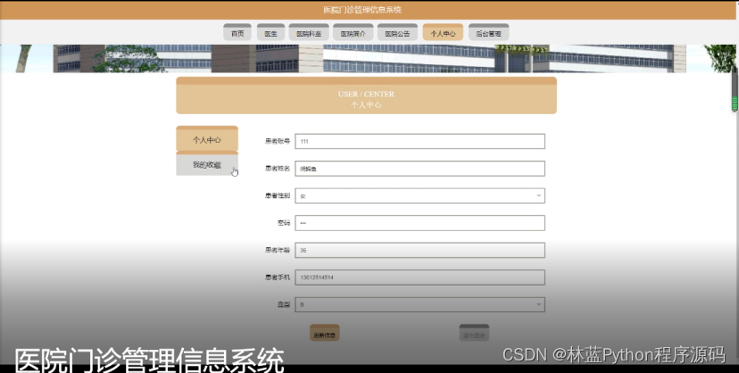 个人中心,在个人中心页面可以查看患者账号,患者姓名,患者性别,密码,患者年龄,患者手机,血型等内容进行更新信息或退出登陆等操作,如图5-7所示。