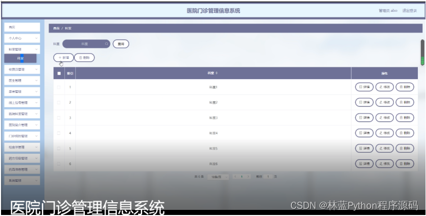 科室管理,在科室页面可以对索引,科室等内容进行详情,修改和删除等操作,如图5-9所示。