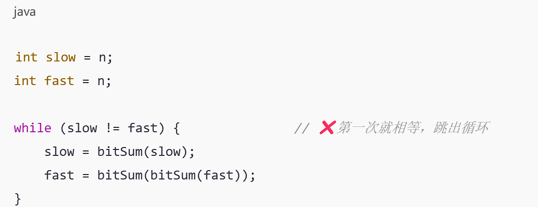 第一次判断时,slow 和 fast 是一样的,直接跳出循环,导致判断错误!