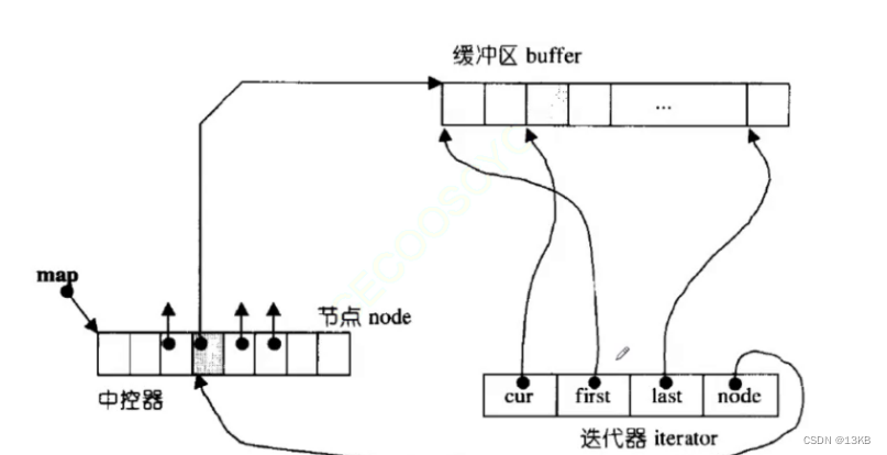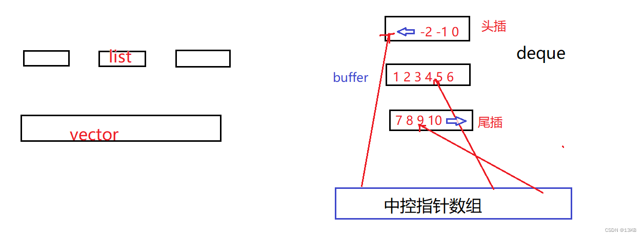 - 不像vector是整块连续空间而是多个小块连续空间插入删除时有的不需要挪动数据。