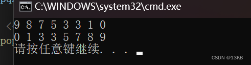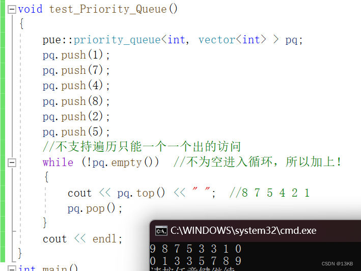 void test_priority_queue2() { int a[] = { 0,3,5,7,1,8,3,9 }; priority_queue<int> pq2(a, a + sizeof(a) / sizeof(int)); while (!pq2.empty()) { cout << pq2.top() << " "; pq2.pop(); } cout << endl; //小堆实现 int b[] = { 0,3,5,7,1,8,3,9 }; priority_queue<int, vector<int>, greater<int>> pq3(b, b + sizeof(b) / sizeof(int)); while (!pq3.empty()) { cout << pq3.top() << " "; pq3.pop(); } cout << endl; }