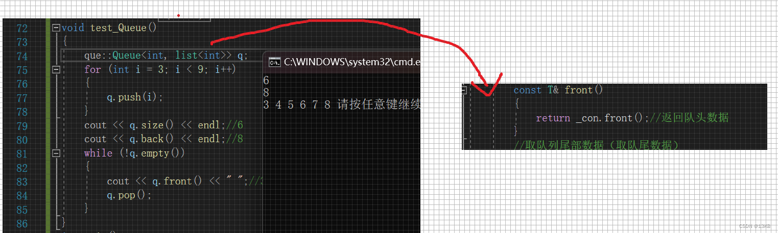 namespace que { template<class T, class Container > class Queue { public: //入列 void push(const T& x) { _con.push_back(x); } //出列 void pop() { _con.pop_front(); } //取队列顶部数据(取队头数据) const T& front() { return _con.front();//返回队头数据 } //取队列尾部数据(取队尾数据) const T& back() { return _con.back();//返回队尾数据 } //获取有效数据个数 size_t size() { return _con.size(); } //判空 bool empty() { return _con.empty(); } private: Container _con; }; }