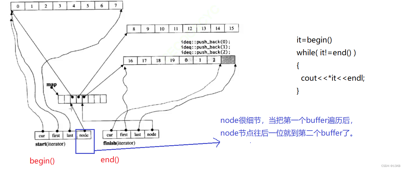 - 不像list是单个结点而是一小块连续空间。可以进行某些随机访问。