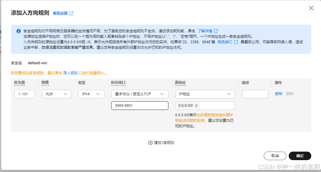VNC 默认使用 5901 端口(对应显示编号 :1),远程连接需要确保该端口在服务器端和网络中是开放的。华为ECS默认的安全策略是禁止这个端口的,所以需要在ECS的控制台中进行修改安全组规则。