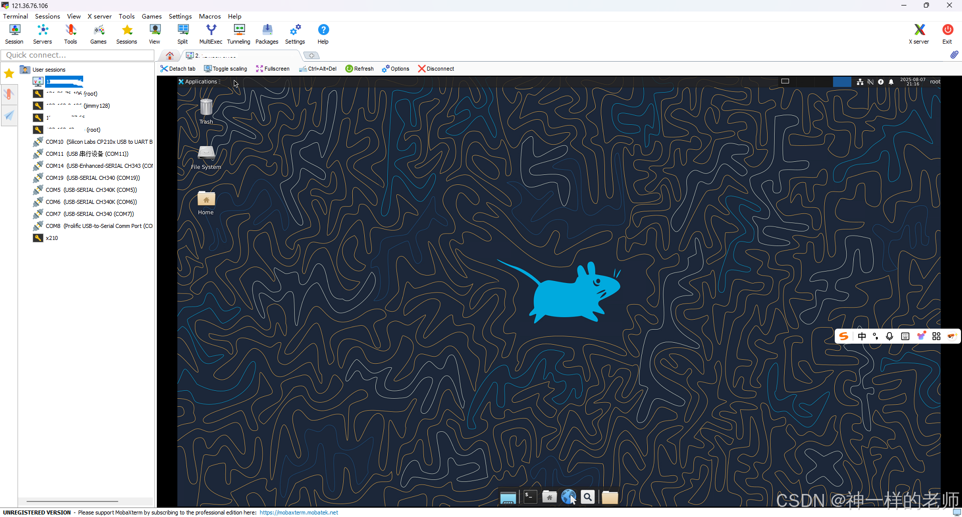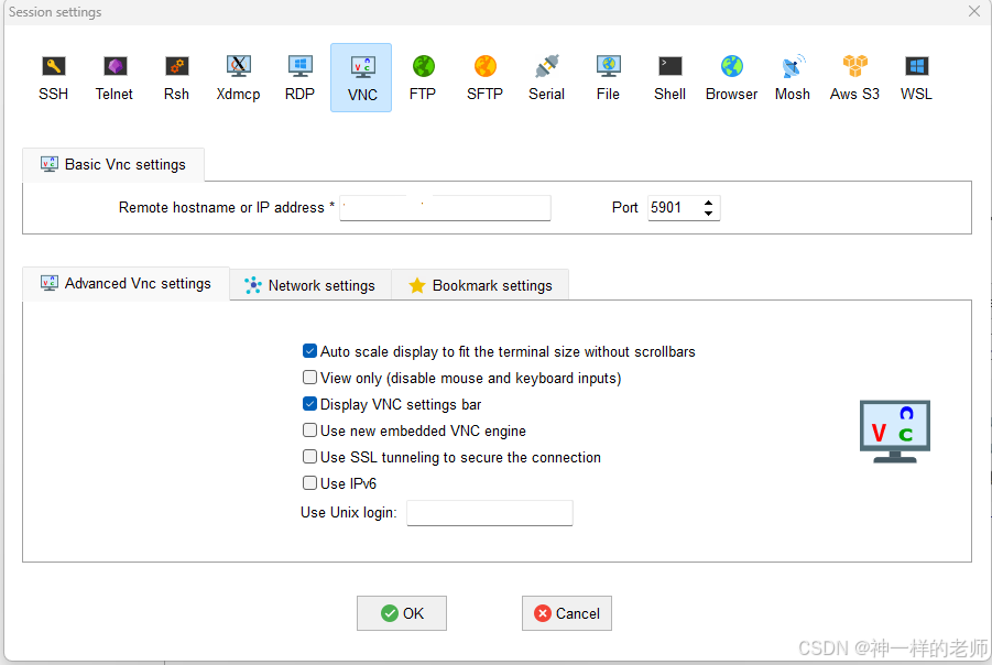 客户端使用的是MobaXterm,在其中创建一个VNC连接,注意端口号设置为5901。