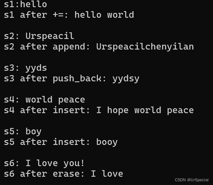 string& erase(size_t pos = 0, size_t len = npos)上面讲的的这个函数,形参len就给了npos为缺省值(默认值),表示如果不指定形参len,那么将删除pos位置到字符串结尾的字符。