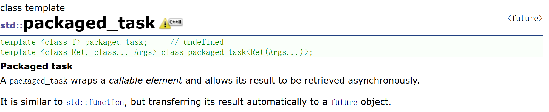 std::packaged_task是一个模板类,它包装一个可调用对象(函数、lambda 表达式等),并允许异步获取其结果。它将任务的执行结果(返回值)保存到它内置的future内,然后在外部通过获取它的内置future可以获取被包装任务的执行结果。