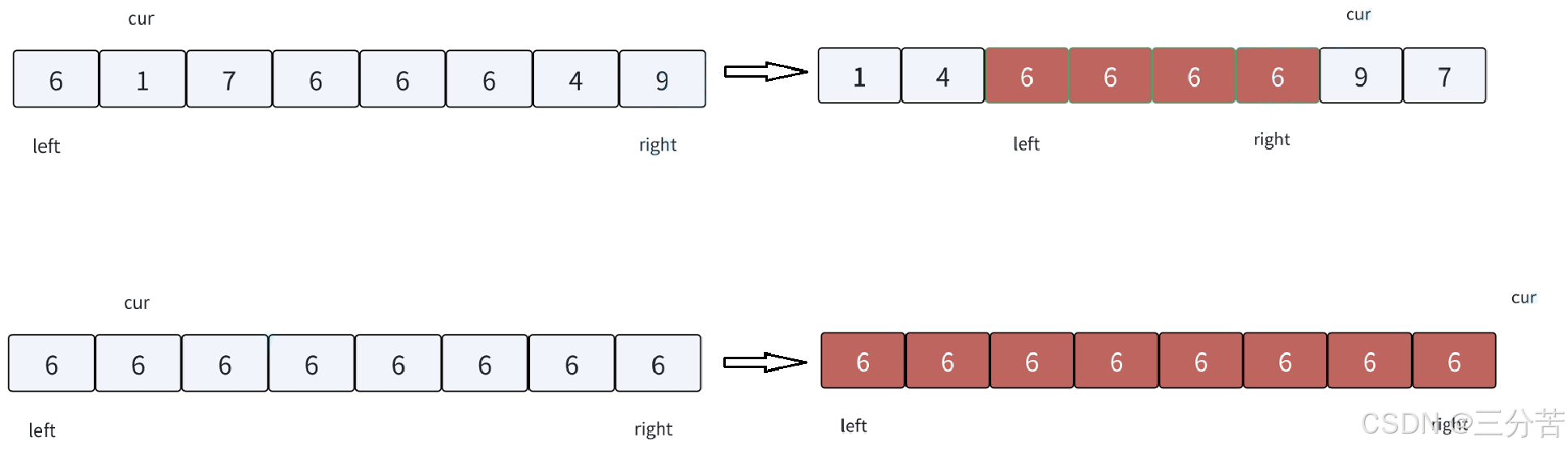 - cur遇到比key小的值后跟left位置交换,换到左边,left++,cur++