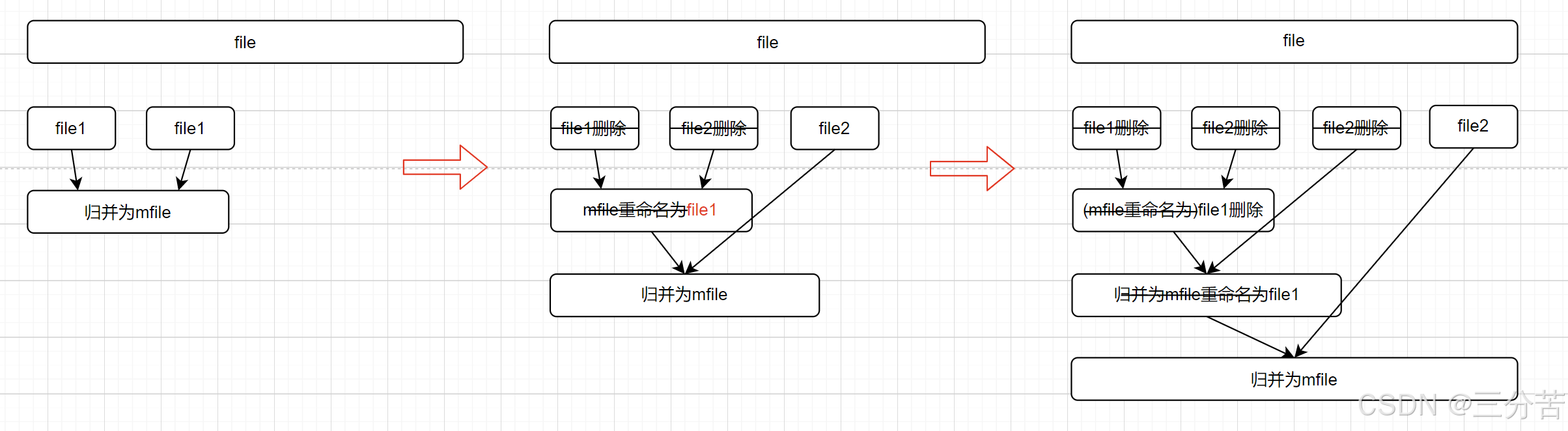 - file1和file2利用归并排序的思想,依次读取比较,取小的尾插到mfile,mfile归并为一个有序文件