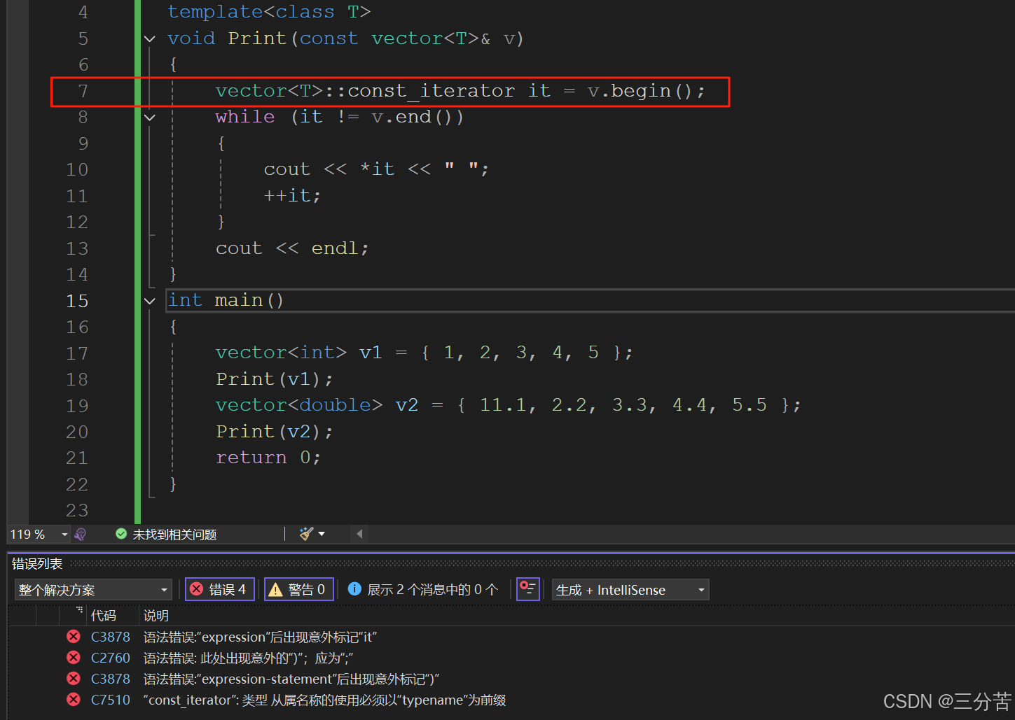 此段代码中,为了让Print函数接收存储各种类型的vector,设计成了模板,但此段代码会编译报错,问题就在于第7行,这是没有实例化好的类模板,因此需要加上typename告诉编译器这是类型,或者更方便点直接使用auto也可: