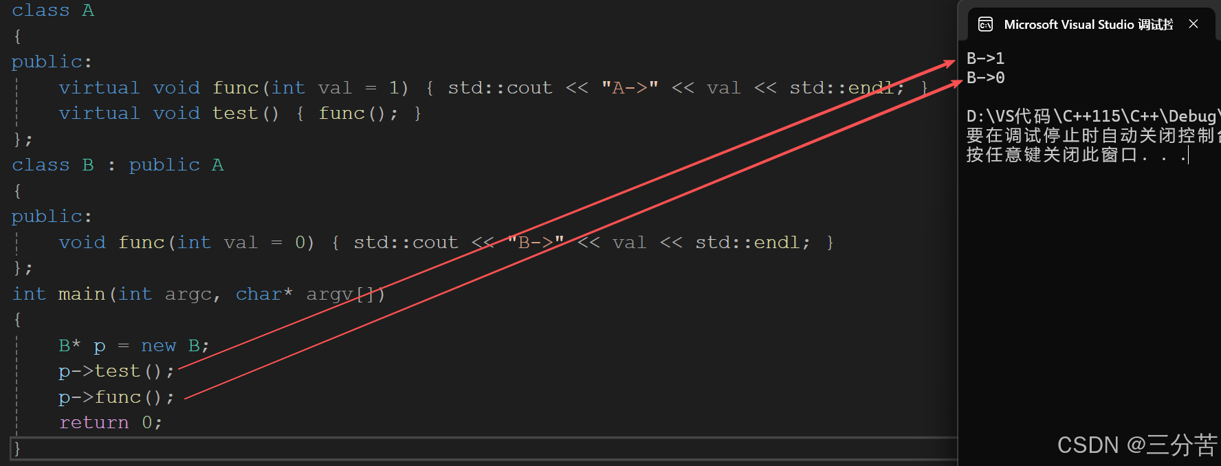 - 注意这里派生类的func函数构成了重写,即使没有加virtual,可以理解多态调用时为父类虚函数的声明加派生类的重写实现,父类函数func的声明用的缺省值为val = 1,那么随后利用派生类的重写实现,则最终结果为B->1