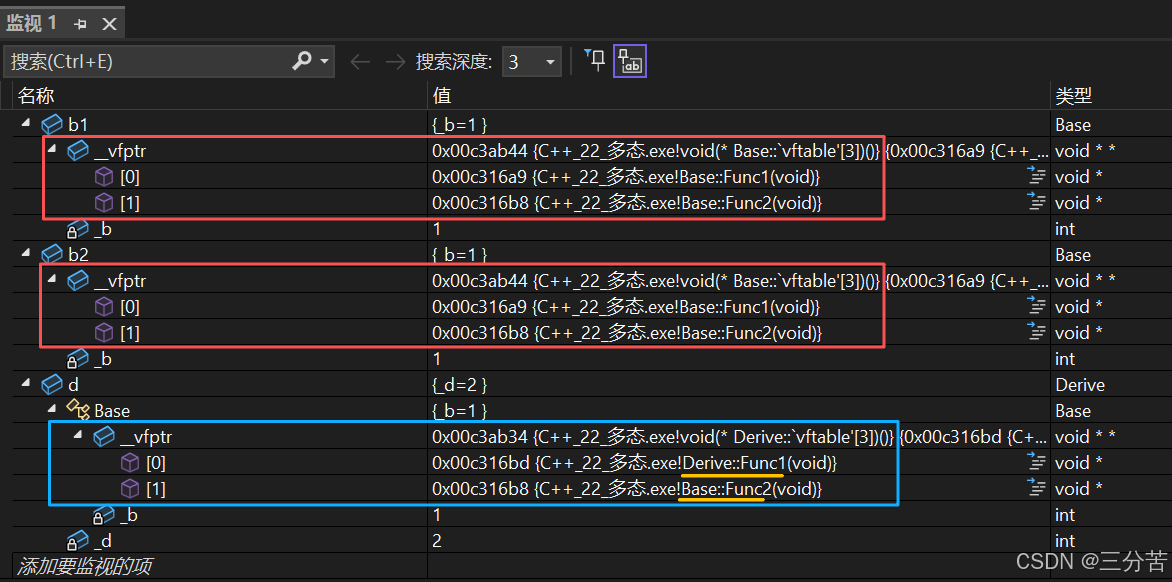 class Base { public: virtual void Func1() { cout << "Base::Func1()" << endl; } virtual void Func2() { cout << "Base::Func2()" << endl; } void Func3() { cout << "Base::Func3()" << endl; } private: int _b = 1; }; class Derive : public Base { public: virtual void Func1() { cout << "Derive::Func1()" << endl; } private: int _d = 2; }; int main() { Base b1; Base b2; Derive d; return 0; }依旧是通过监视窗口来看看父类对象b和子类对象d的内部组成结构: