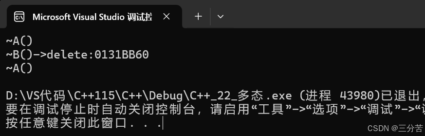 这里很明显结果是我们所预期的,先释放指向父类的对象,再释放指向子类的对象(继承后的析构为先子后父),正是由于基类的析构函数加上了virtual变成虚函数,才得以让父类和子类的析构函数构成重写,完成多态调用。才能析构正确。