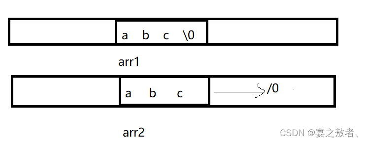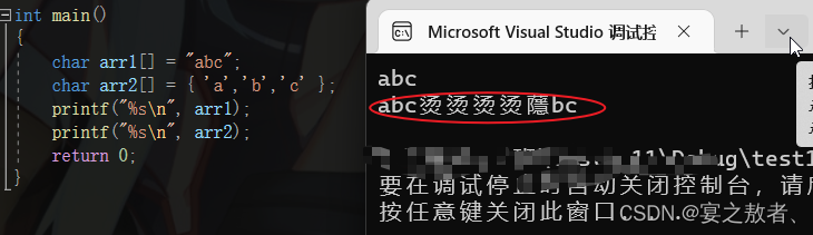 其实是这样的:\0是打印的结束标志,arr1中存在\0,所以打印完就会停止,而arr2本身没有\o则会继续打印直到找到\0为止,所以就会出现上面的状况