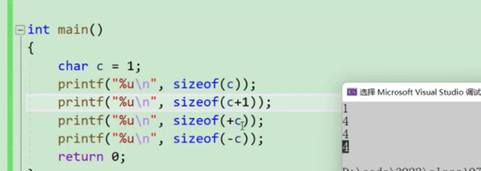 只有第一个结果是1,因为这里的c只要是表达式就会涉及运算,就会涉及整型提升,无论是否有意义。
