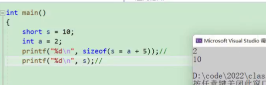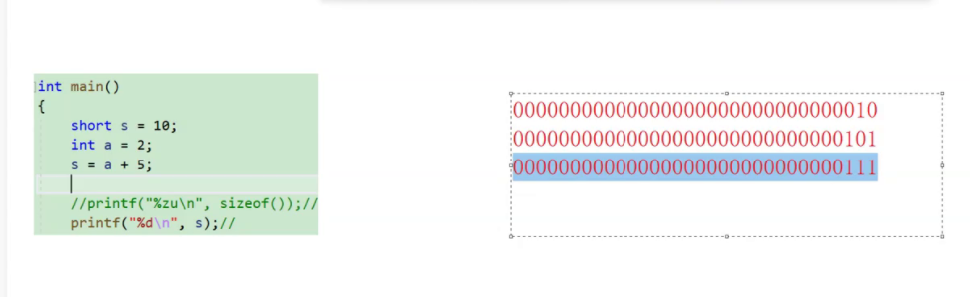 a 是int类型,a+5也同样是int类型,但s却是short类型,只有2字节的空间,但必须要把int类型的值放在short类型的变量中去,这时就会发生“截断”(把4个字节砍掉2个字节)再放进去,这样打印的就是short类型就是2.