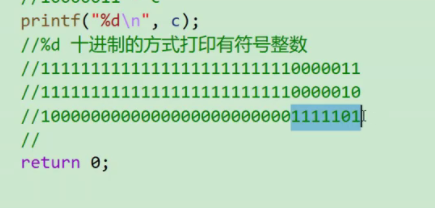 这里的c不够,我们就需要整型提升得补码,-1得反码,再按位取反得原码