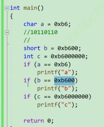 打印出来的结果是只有c,因为a b 应该char 类型 一个short 类型,打印就需要整型提升,提升后与原数值不符