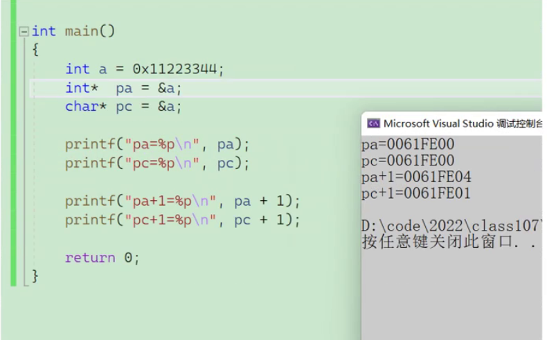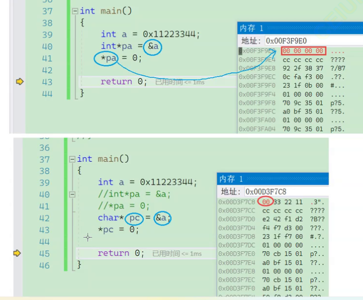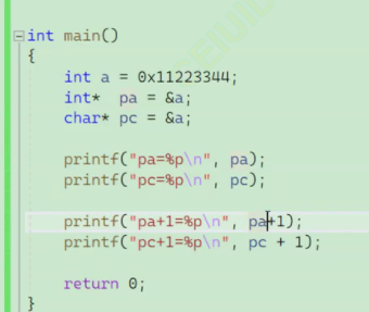 这里的int类型的pa指针代码运行时操作了4个字节的数据,而char类型的指针只操作了1个字节的数据