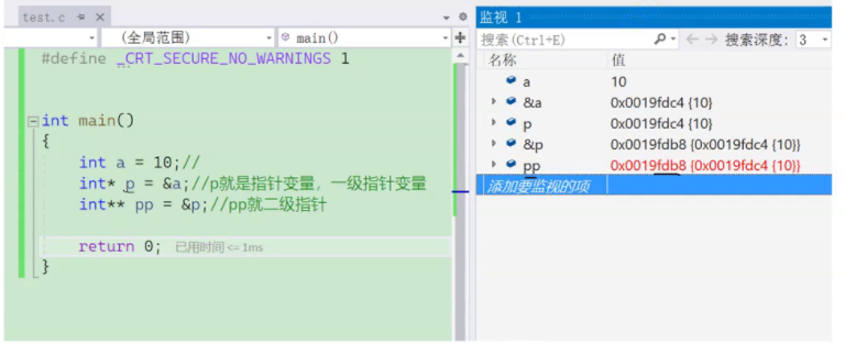 p里面存的是a的地址,pp里面存的是p的地址