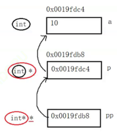 a的类型是int;p的类型是int*,这里的 * 则表示p是一个指针,前面的int的意思就是p指向的对象的类型是int;pp的类型是int**,*的意思就是pp是一个指针,int*则表示pp指向的对象的类型是int*