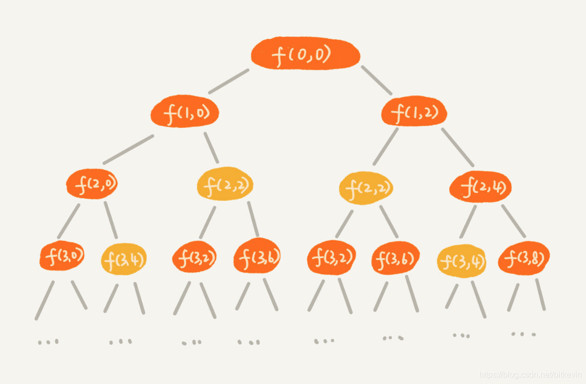 回溯算法非常适合使用递归来实现,代码实现简单,但往往有很多重复计算,计算过程如下图: