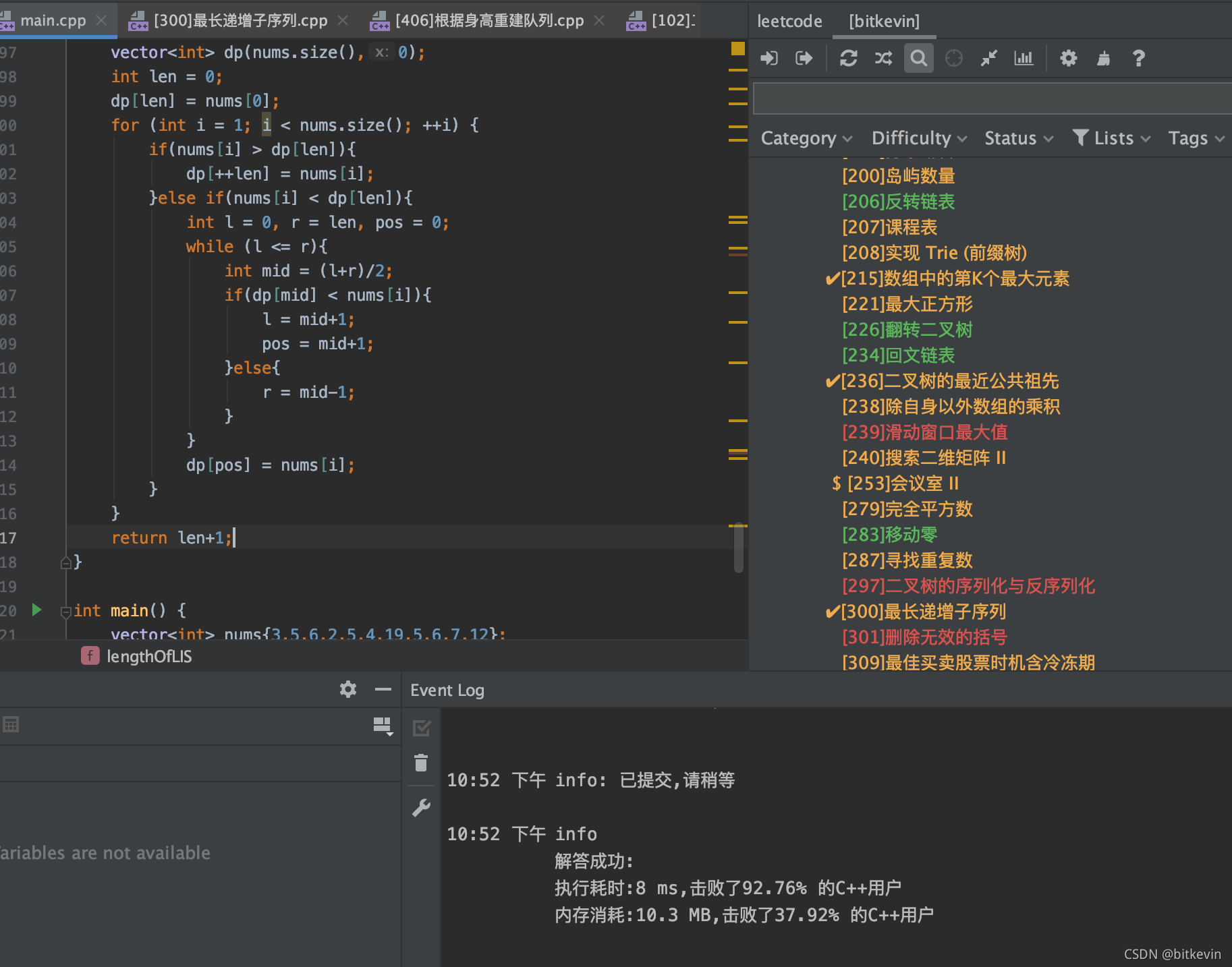觉得测试没有问题了,就可以“leetcode editor menu”->"Submit",提交代码了。提交之后下发Event Log输出框会显示解答是否成功,耗时和内存消耗。