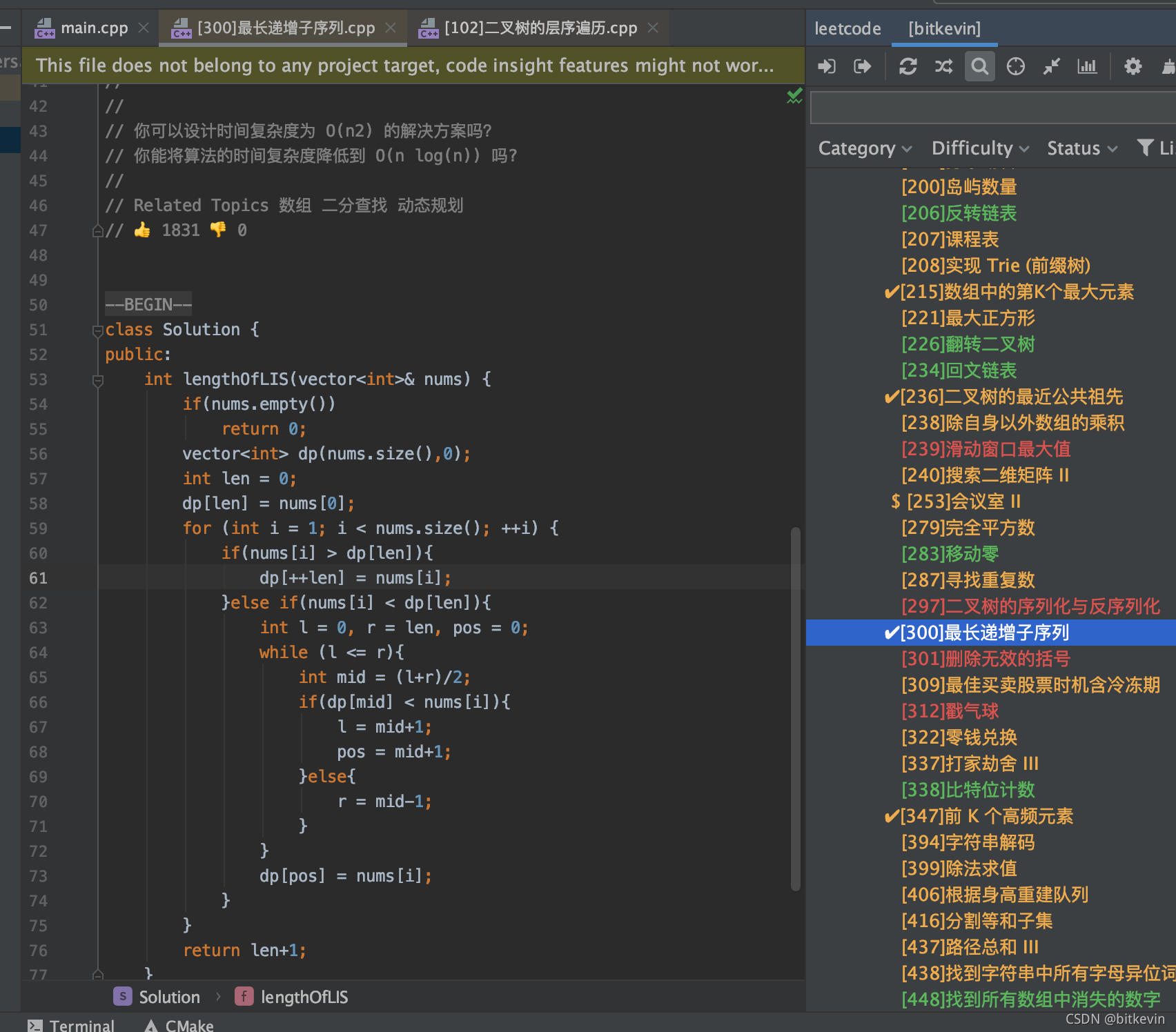 在右侧LeetCode工具栏中选择对应的试题,双击就可以打开试题。上面注释是试题说明,和LeetCode网页相同,除了没有图例。下方代码区编写代码,不过直接在试题文件里编写代码也是没有语法检查和调试功能的,我一般都是复制函数体,然后在自己的工程文件中编写调试的。