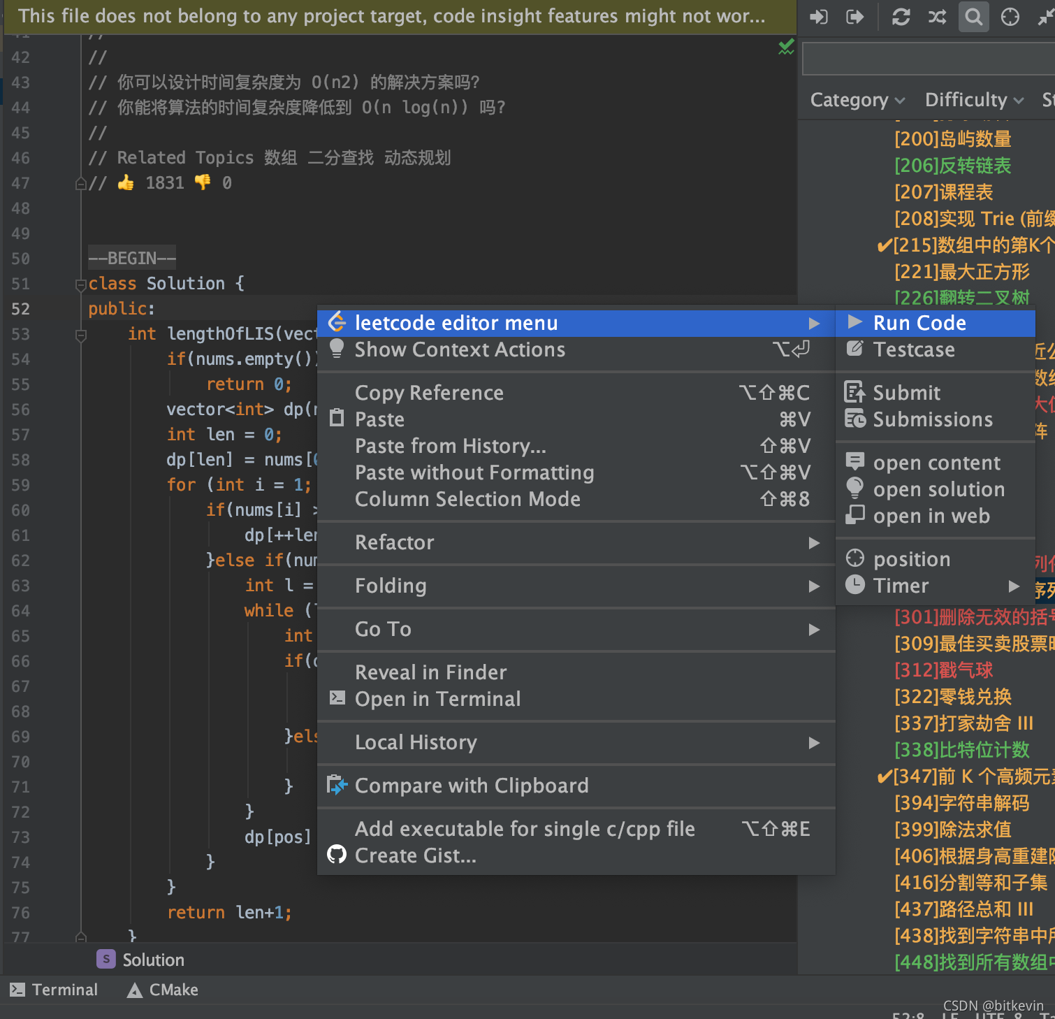 写完代码之后,在代码区右键选择“leetcode editor menu”->"Run Code"运行测试用例,或通过“Test Code”菜单修改用例后再次运行。