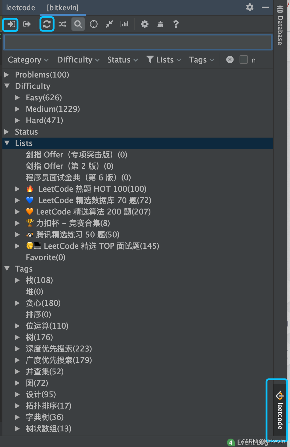 在IDE右侧边栏中,找到LeetCode Log,点击打开LeetCode工具栏。点击