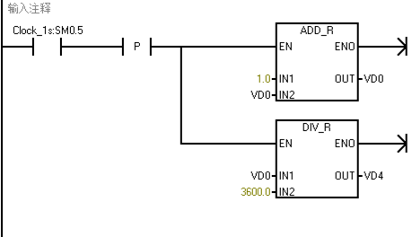 在另外一些应用场景中,有时需要记录现场设备的运行时间,一般情况下我们可以使用定时器来实现计时的功能,但S7-200 SMART定时器有数量限制(最大256个),并且最大时基为100ms的定时器其所能达到的最大计时长度为3276.7S,若想实现小时或者天的计时就需要定时器加计数器来实现,而计数器也有数量限制(最大256个),当需要类似的功能很多时,计数器和定时器数量就不够用了,此时可以使用系统特殊存储器 SM0.4(周期为60S的时钟脉冲)和SM0.5(周期为1S的时钟脉冲)来实现计时功能。