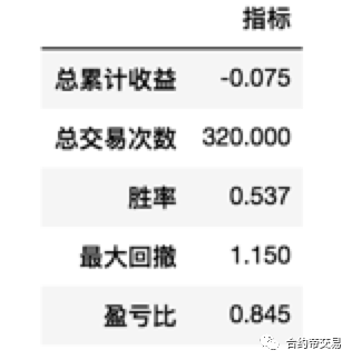 胜率为53.7%, 非常接近50%, 而盈亏比为0.84, 接近于1, 这两个指标告诉我们, 随机交易时, 输赢次数大抵是相当的, 且最终总盈利与总亏损同样是大抵相当的。