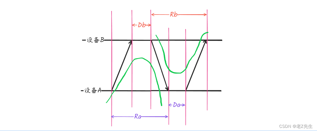在无线电TOF测距原理(1) - 你眼中的TOF与真实的TOF-优快云博客中已知双向TOF可以认为是两次单边TOF测量的平均值,如下图所示: