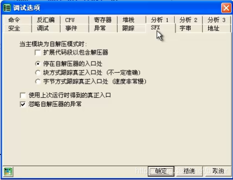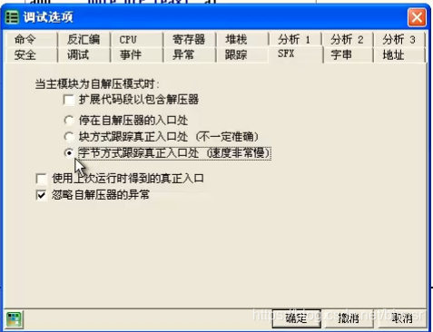 2.1先把od的选项调试中的sfx选项选择“字节方式跟踪真正入口处(速度非常慢)”