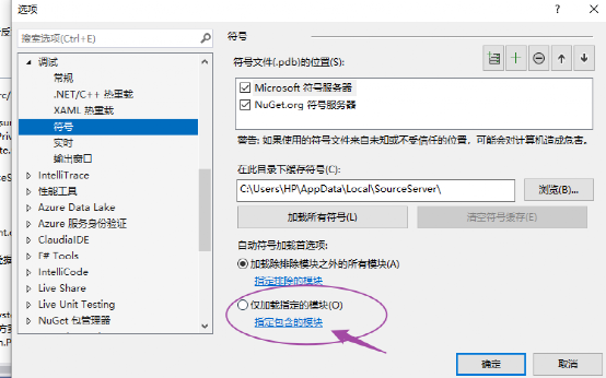 1)选择工具>选项>调试>符号,并确保已选中“ Microsoft符号服务器(.NET框架相关的库)和NuGet.org符号服务器”选项。为符号高速缓存指定目录是避免再次下载相同符号,提高源码查看效率。