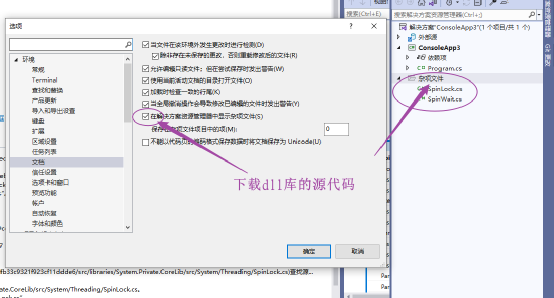 3)在“工具” >“环境” >“文档” >勾选【在解决方案的管理器中显示杂项】点击完成,再次运行调试的时候,编译器就会从https://raw.githubusercontent.com/下载Dll库的源代码(仅限.net core)