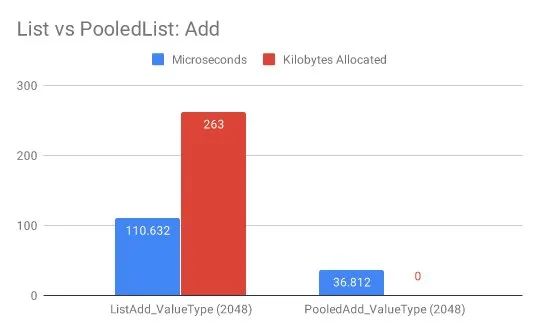 在Benchmark中循环向集合添加2048个元素,.NET原生的List<T>需要110us(根据实际跑分结果,图中的毫秒应该是笔误)和263KB内存,而PooledList<T>只需要36us和0KB内存。