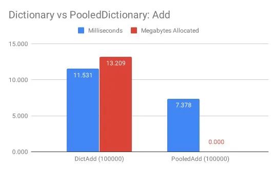 在Benchmark中循环向字典添加10_0000个元素,.NET原生的Dictionary<TKey, TValue>需要11ms和13MB内存,而PooledDictionary<TKey, TValue>只需要7ms和0MB内存。