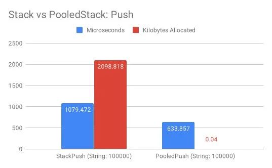 在Benchmark中循环向栈添加10_0000个元素,.NET原生的PooledStack<T>需要1079ms和2MB,而PooledStack<T>只需要633ms和0MB内存。