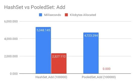 在Benchmark中循环向哈希集合添加10_0000个元素,.NET原生的HashSet<T>需要5348ms和2MB,而PooledSet<T>只需要4723ms和0MB内存。