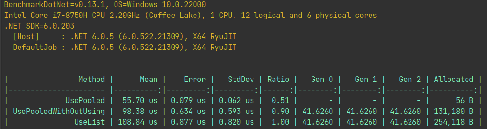 但是我们需要注意,Pooled类型实现了IDispose接口,它通过Dispose()方法将使用的内存归还到池中,所以我们需要在使用完Pooled集合对象以后调用它的Dispose()方法。或者可以直接使用using var关键字。