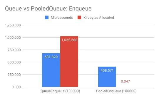 在Benchmark中循环向队列添加10_0000个元素,.NET原生的PooledQueue<T>需要681ms和1MB,而PooledQueue<T>只需要408ms和0MB内存。