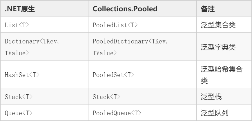 在Collections.Pooled类库中,它针对我们常使用的集合类型都实现了池化的版本,和.NET原生类型的对比如下所示。
