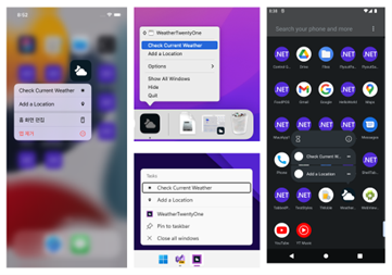 .NET MAUI 提供简单的 API 来访问每个平台的服务和功能,例如加速度计、应用程序操作、文件系统、通知等等。在此示例中,我们配置“应用程序操作”,为每个平台上的应用程序图标添加菜单选项: