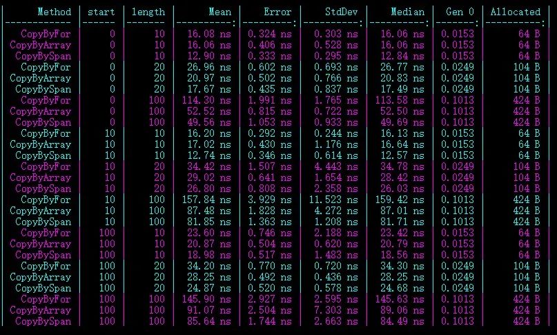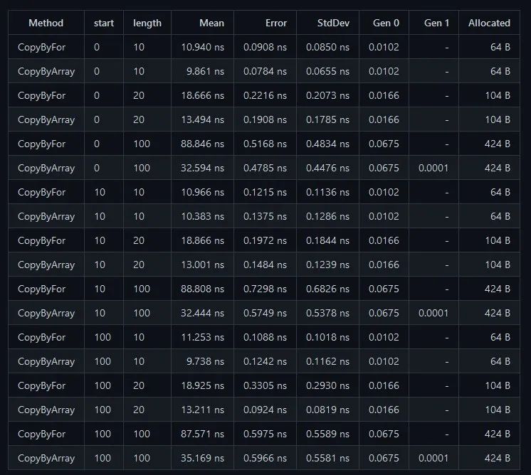 拷贝某个数组的从某个起始点加上某个长度的数据到另一个数组里面,可选方法有很多,本文仅列举出使用 for 循环拷贝,和使用 Array.Copy 方法和用 Span 方法进行拷贝进行对比