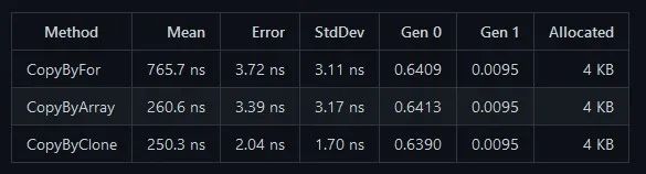 通过下图可以了解到采用 Clone 方法和采用 Array.Copy 方法的性能差不多,但 Clone 稍微快一点