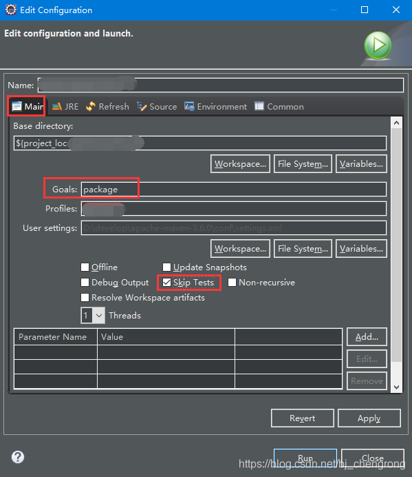 6、main选项卡, Goals中填写 package, 勾选Skip Tests