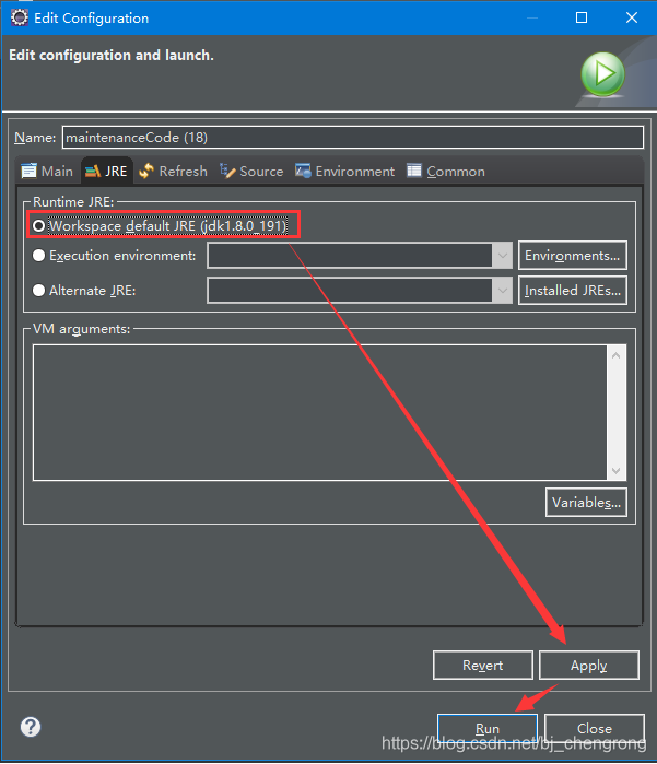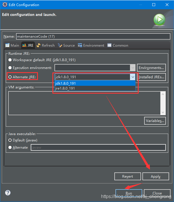 7、JRE选项卡, 这里要选择JDK 不能用JRE, 先Apply 再 Run